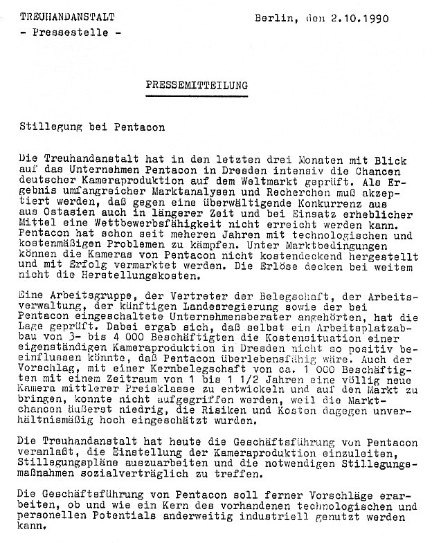 Liquidation of VEB Pentacon Dresden Betrieb des Kombinates VEB Carl Zeiss JenaIn dependence of the political changes in the late eighties in the GDR and the reunification of FRG and GDR called "Wende" multiple GDR-"Kombinate" lost there markets. In the result of the fusion of the east German markets with the markets of the former West Germany induces an explosion of the costs of production and development for the former socialist companies. Although the hope for a commercial convalescence are palpable and a concept of redevelopment of Pentacon Dresden were created the Pentacon Dresden GmbH were liquidated by the "Treuhandanstalt" as the first affiliated group of the former GDR. The liquidation takes place on the October 2, 1990 one day in front of the reunification day of Germany and on the opening day of the "photokina '90" in Cologne.